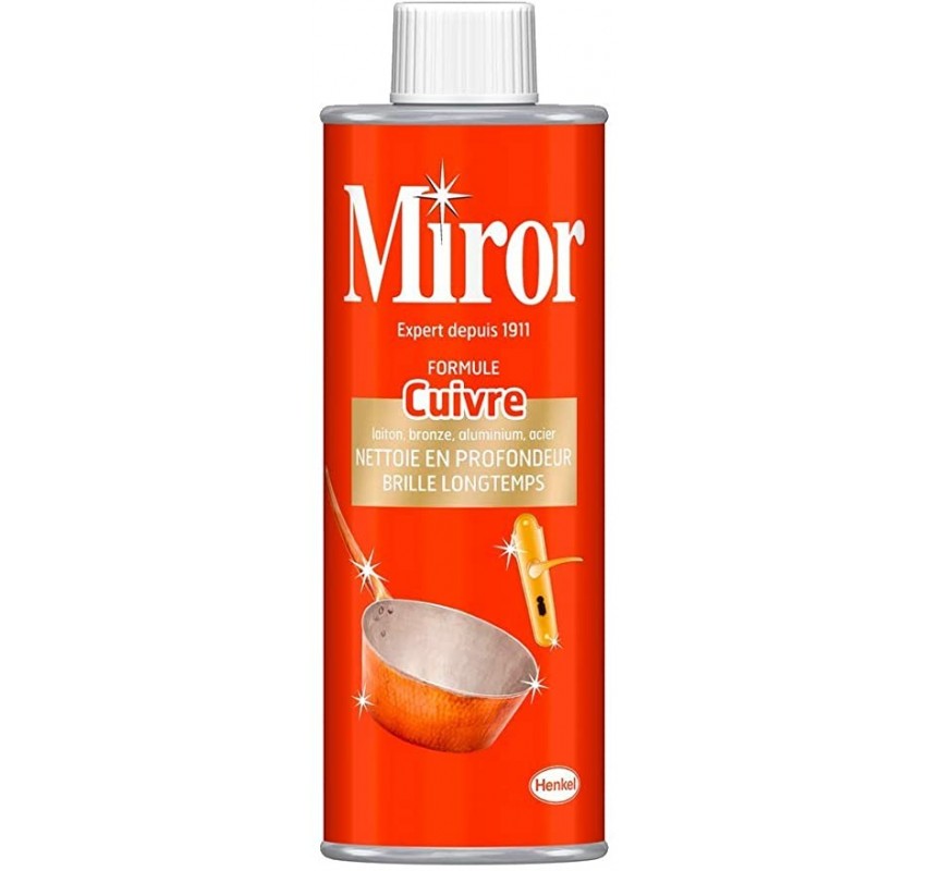 Formule cuivre, nettoyant laiton, bronze, aluminium, acier. Grâce à une formule anti-oxydante, Miror élimine les ternnissures et retarde la réoxydation pendant plusieurs mois. La formule Cuivre est également recommandée pour nettoyaer les jantes de voiture et de moto, les rayons de bycyclette, les brûleurs de gazinière, les chenets de cheminée, les plastiques rigides (plexiglas) ainsi que les surfaces en peinture laquée ou émaillée.