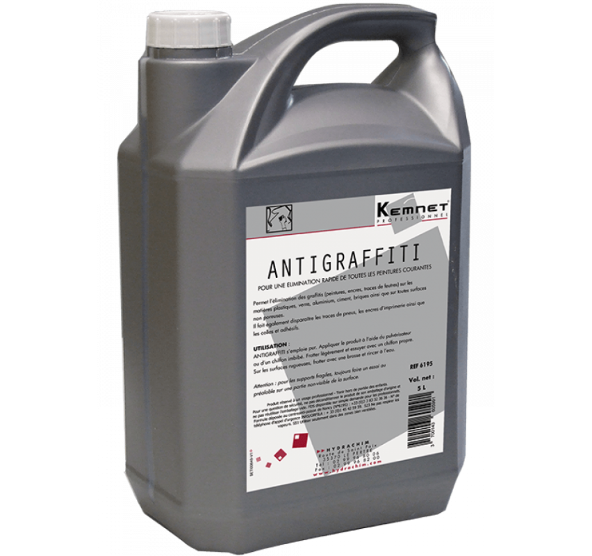 Antigraffiti permet l'élimination des graffitis (peintures, encres, traces de feutres). Il élimine les graffitis sur les matières plastiques, verre aluminium, ciment, briques ainsi que sur toutes surfaces non poreuses. Il fait également disparaître les traces de pneus, les encres d'imprimerie, ainsi que les colles et adhésifs.